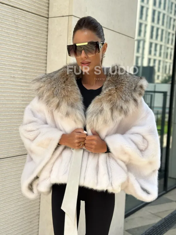 Белое норковое манто с капюшоном из меха рыси – выбор девушек, которые готовы экспериментировать. Летучка сделает ваш образ легким и воздушным. Необычный цвет напомнит о лете и освежит ваш стиль. Нежный мех бережно согреет владелицу в любые холода. Шикарный капюшон из рыси позаботится, чтобы волосы были в тепле.
