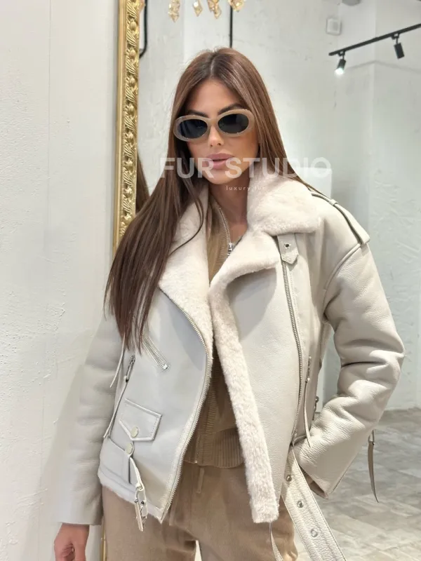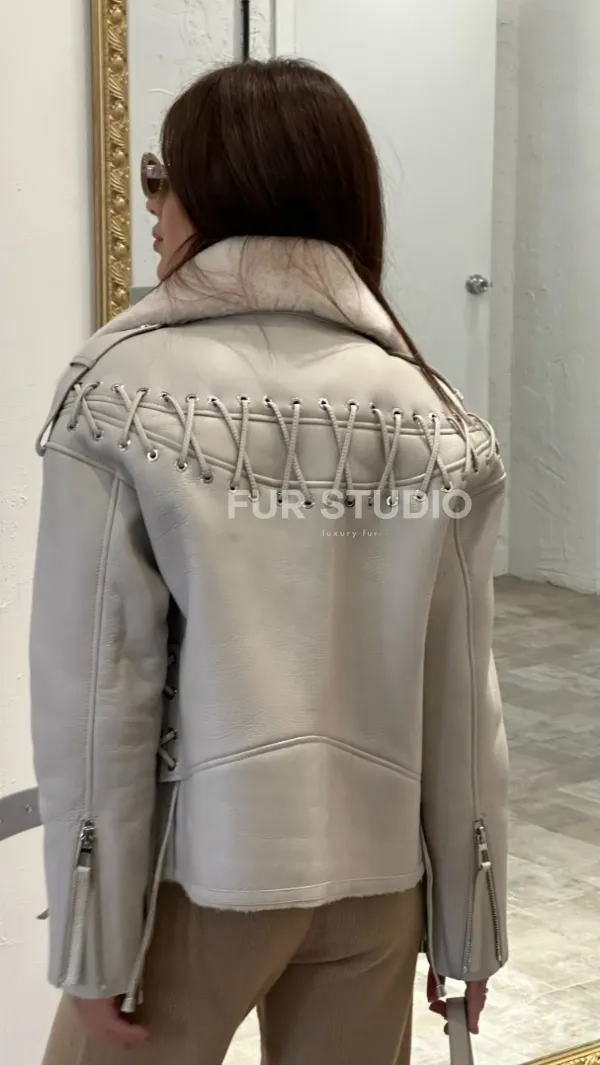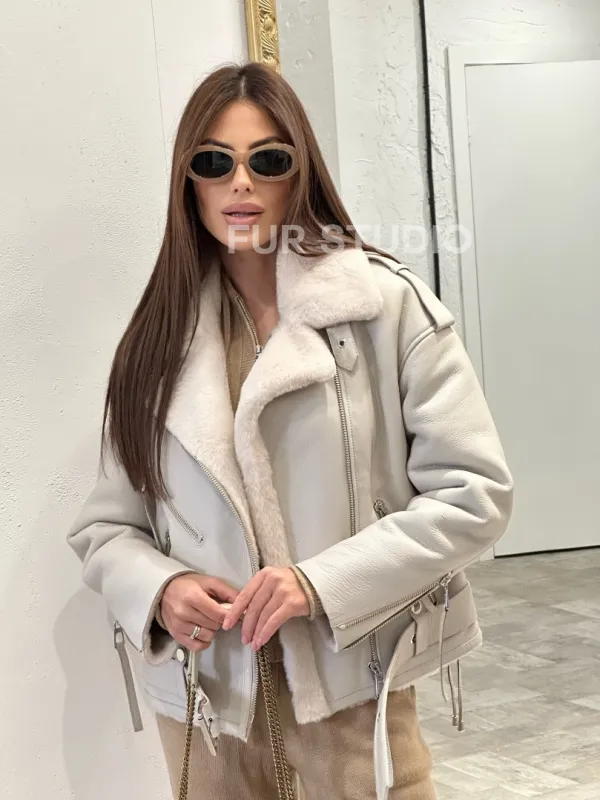 Светлый оттенок делает образ женственным и нежным. Оригинальные фермуары на рукавах можно расстегнуть, если необходимо. Модель сочетается с джинсами, леггинсами, подойдет под классический стиль. Купить дубленку - авиатор из натуральной овчины со шнуровкой могут девушки, которые любят выглядеть экстравагантно вне зависимости от времени года.