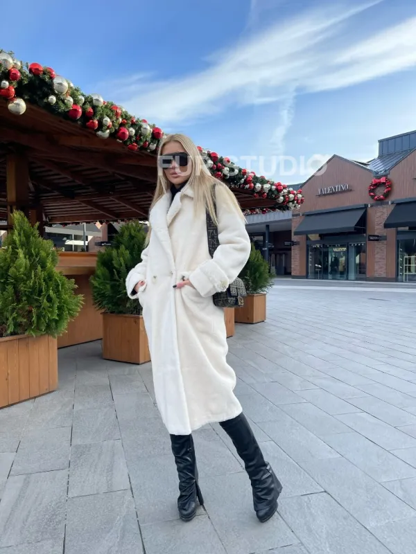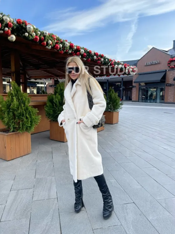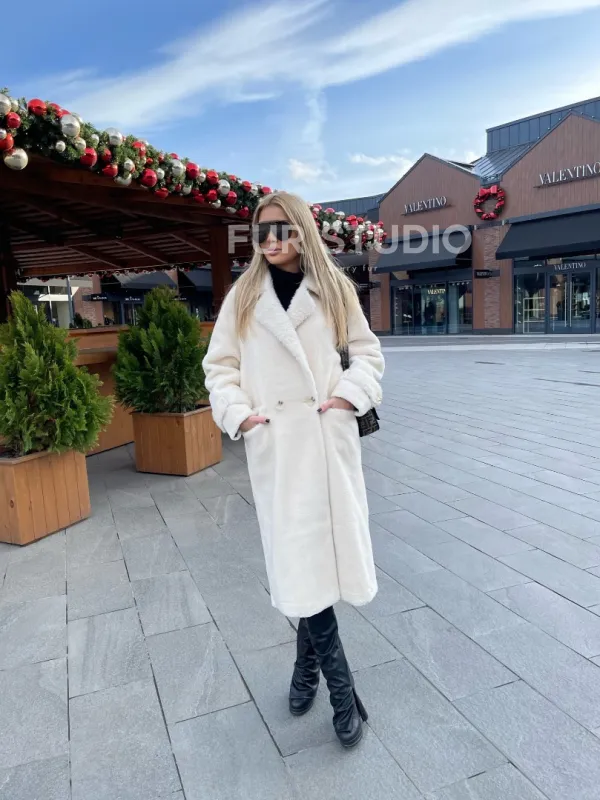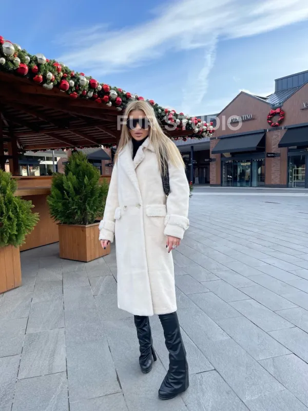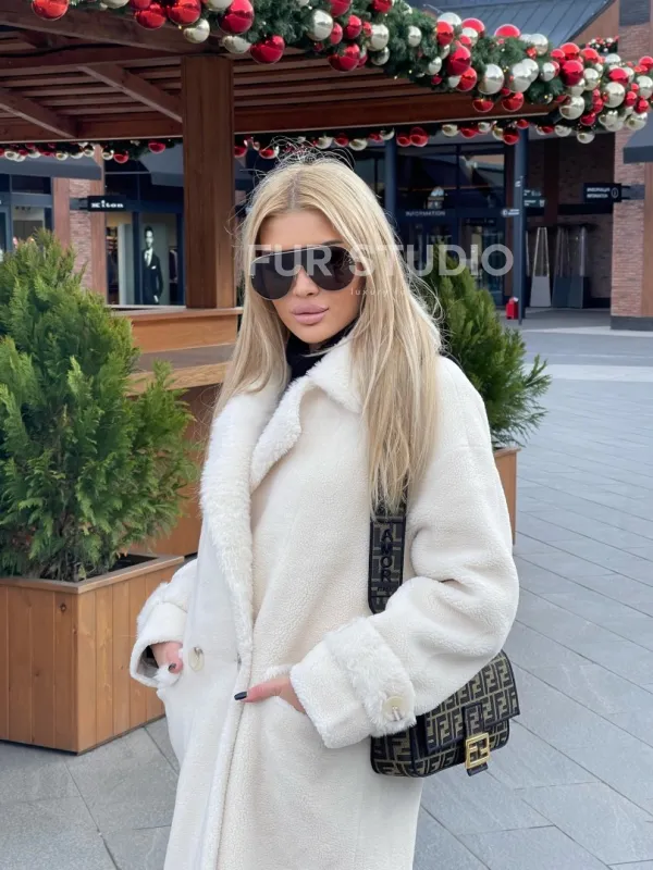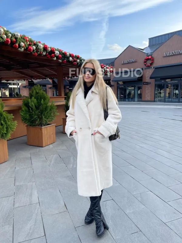 Экошуба в белом цвете с английским воротником - выбор истинных леди. Модель создаст образ снежной королевы. Экомех отличная альтернатива натуральному для тех, у кого ограничен бюджет. Оригинальный воротник подчеркнет изящную шею. Широкие манжеты акцентируют внимание на тонких кистях. Длина оптимальна и комфортна в носке.