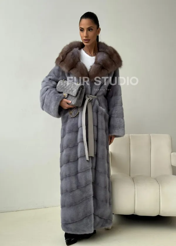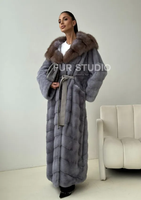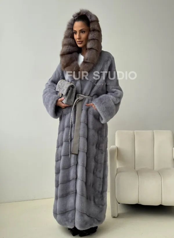 Голубая норковая шуба с капюшоном куницы 102439