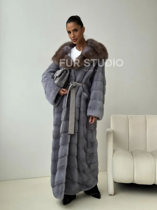Мех данной шубы аукционная норка, цвет голубой. Предлагается в размерах от 42 до 48 (oversize). Длина модели 135-140 см, что выгодно подчеркивает фигуру девушек. Эта модель идеально подойдет для девушек и женщин, предпочитающих роскошные натуральные меха.