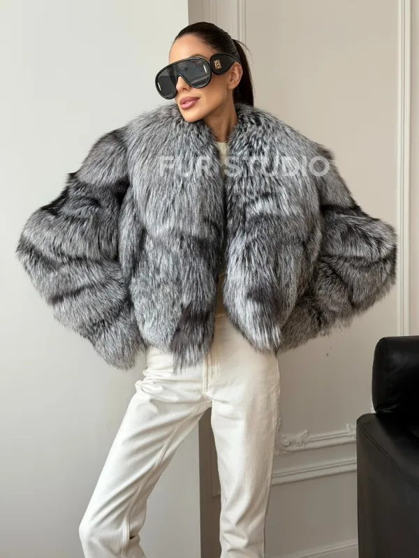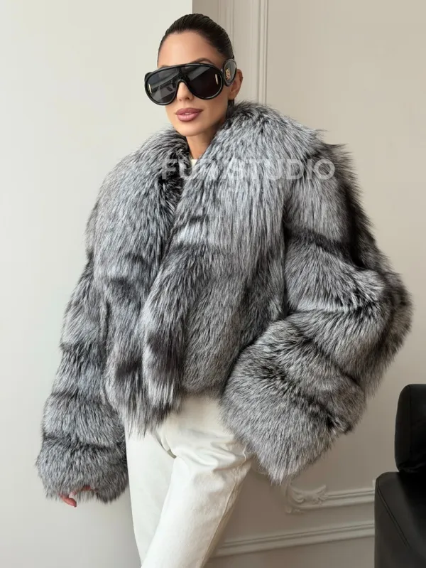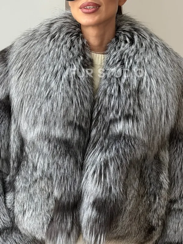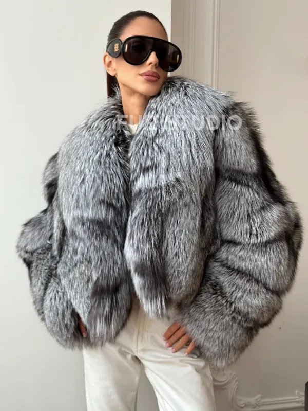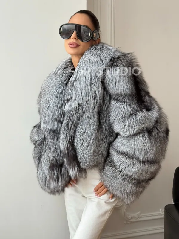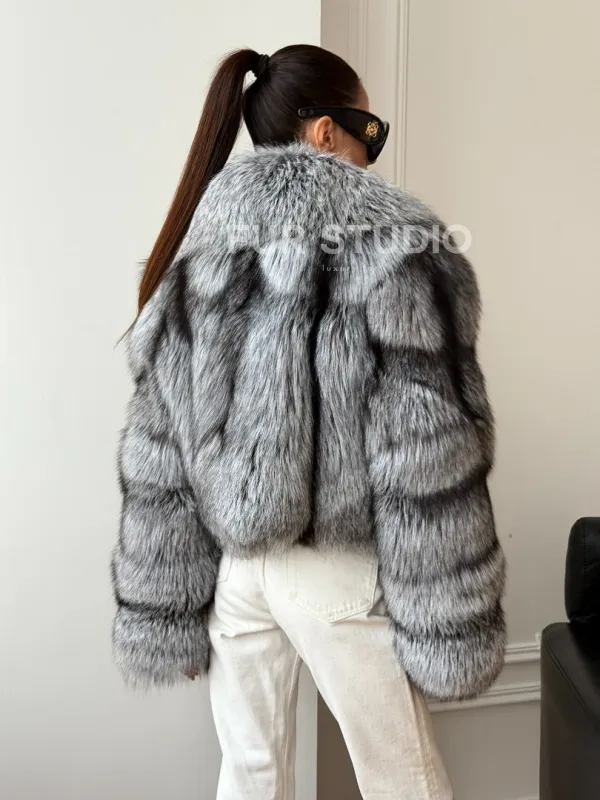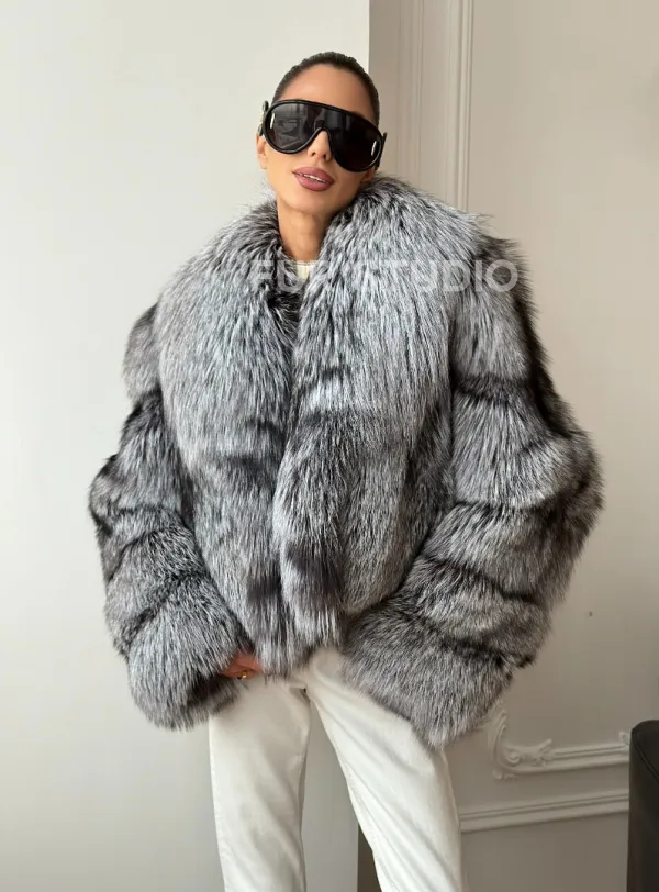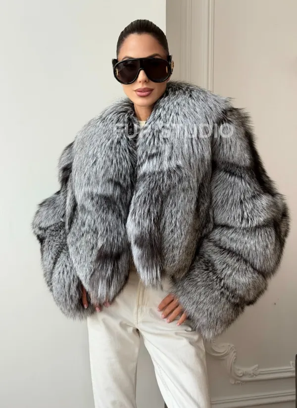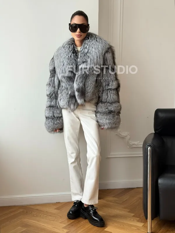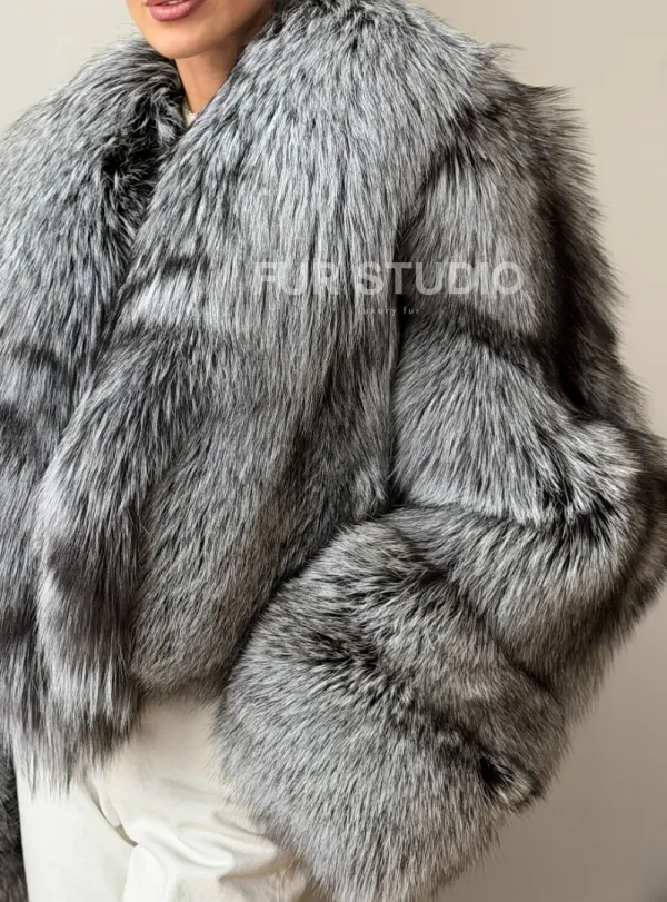 Мех данной шубы лиса, цвет серый. Предлагается в размерах от 42 до 48. Длина модели 50-55 см, что выгодно подчеркивает фигуру девушек. Эта модель идеально подойдет для девушек и женщин, предпочитающих роскошные натуральные меха.