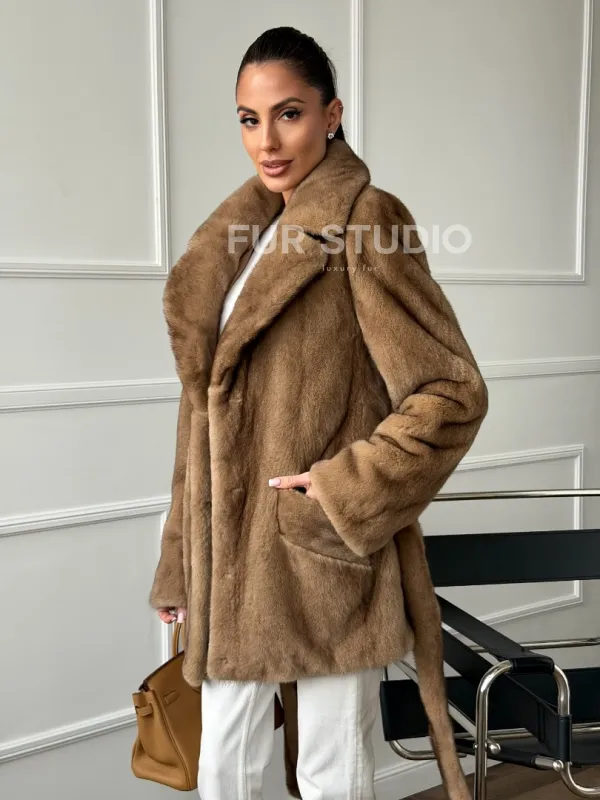 Полушубок норковый пастель с меховым поясом 102664