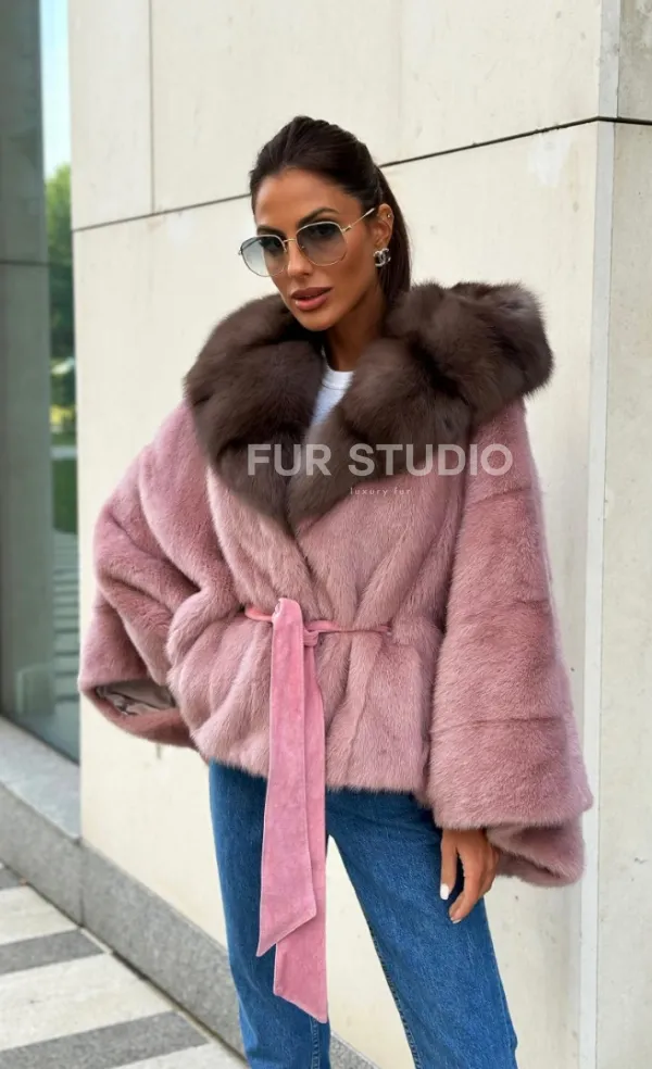 Мех данной шубы аукционная норка, цвет розовый. Предлагается в размерах от 40 до 50. Длина модели 50-55 см, что выгодно подчеркивает фигуру девушек. Эта модель идеально подойдет для девушек и женщин, предпочитающих роскошные натуральные меха.