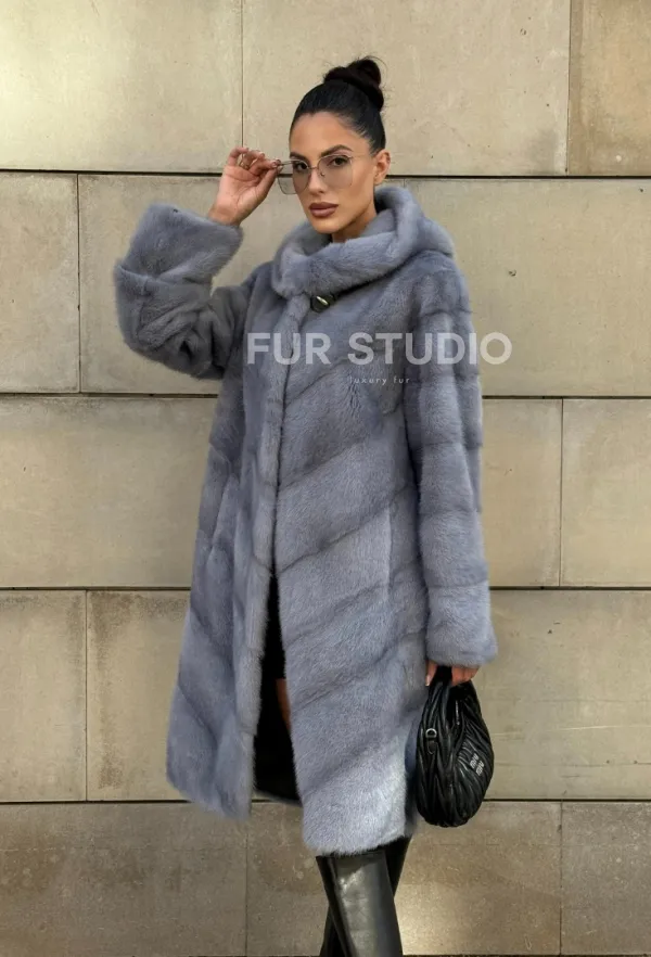 Мех данной шубы аукционная норка, цвет голубой. Предлагается в размерах от 42 до 50. Длина модели 95-100 см, что выгодно подчеркивает фигуру девушек. Эта модель идеально подойдет для девушек и женщин, предпочитающих роскошные натуральные меха.
