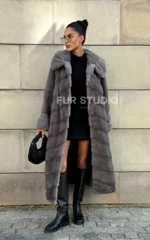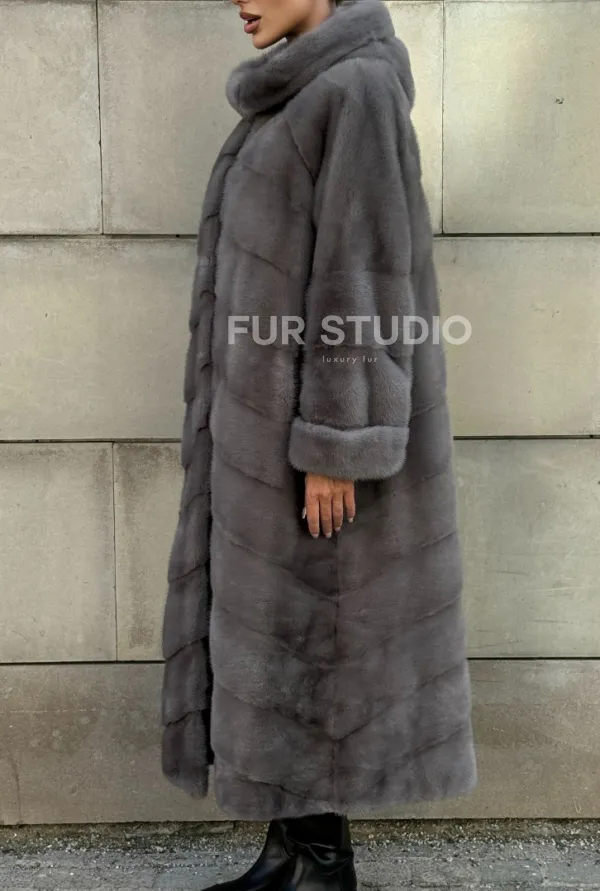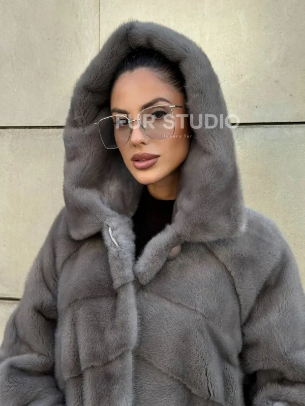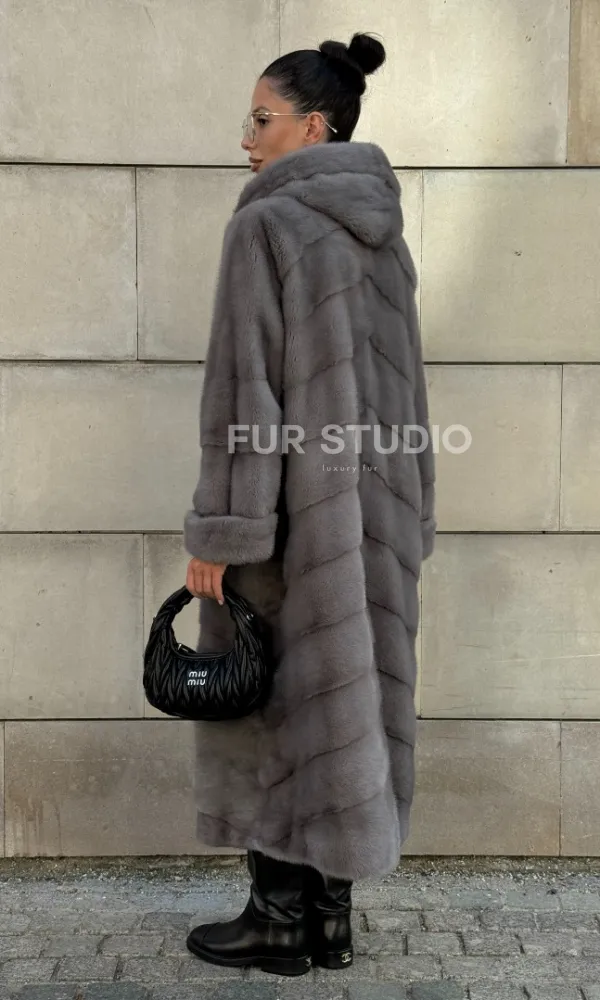 Шуба в диагональной выкладке меха норки, графит грей с капюшоном 101067